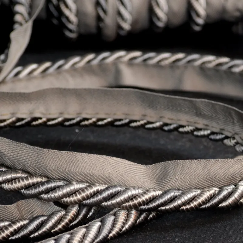 Grey lip cord trim. BC 10003 49 Grey from Bellagio and Nantucket is a decorative cording trim with a lip for sewing into pillows or cushions.