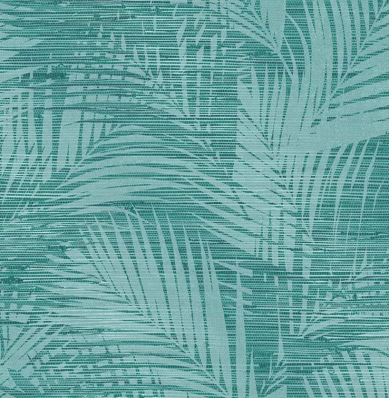 Bold and bright, this large palm print wallpaper has a chic botanical feel. Raised inks and subtle metallic ink create a glamorous turquoise faux grasscloth design. Motmot is an unpasted, non woven wallpaper.