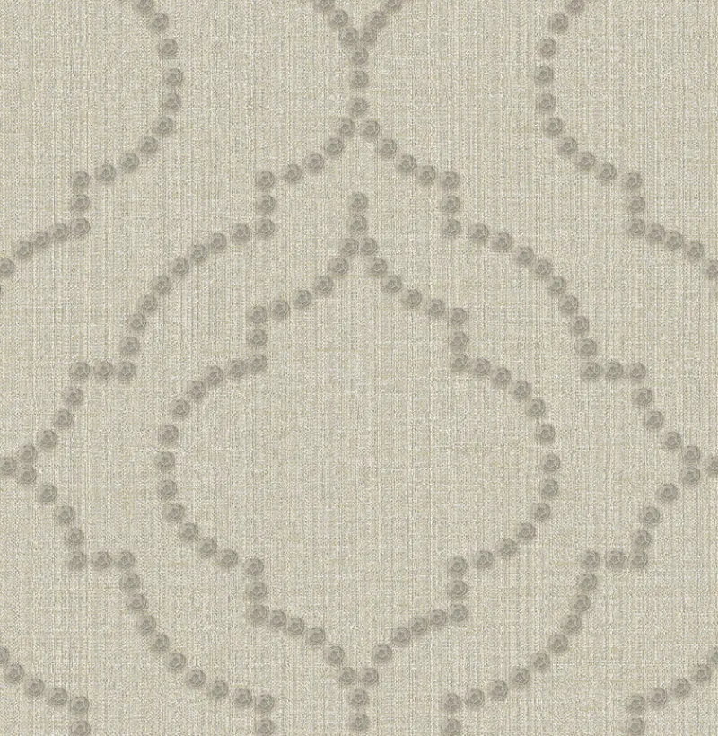 With beautiful wheat tones and grey threads, this intricate faux weave wallpaper is truly beautiful. The riveted quatrefoil design adds a chic touch to this already luxurious paper. Garett is an unpasted, non woven wallpaper.