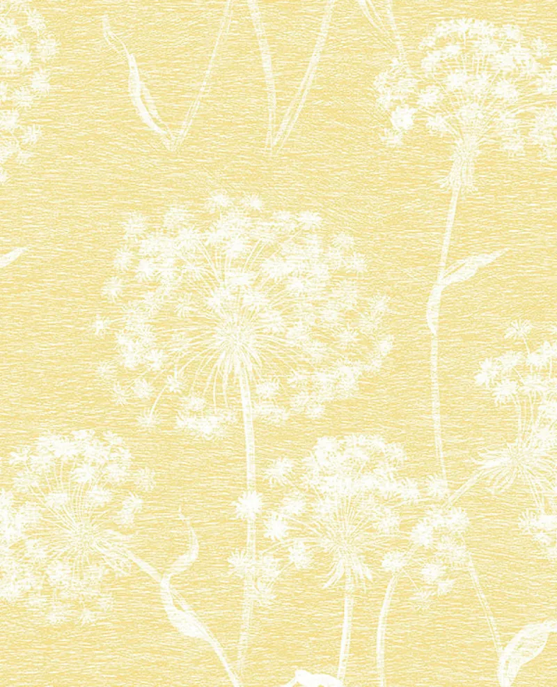 Brighten up rooms with this cheerful yellow wallpaper. Its large-scale, white dandelion print has a dreamy feel, while distressed accents emphasize its organic style. Garvey is an unpasted, non woven wallpaper.