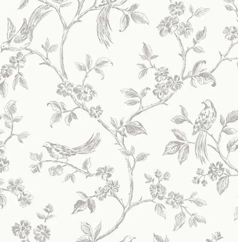With a hand drawn style, this delightful trail wallpaper has a whimsical feel. Its grey pattern, featuring birds and flowers, pops against an off-white background. Aaron is an unpasted, non woven wallpaper.