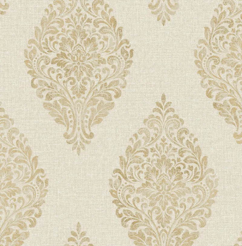 Gold damasks softly glimmer against a beige background. Distressed accents give this ornate fabric inspired wallpaper an antiquated style. Pascale is an unpasted, non woven wallpaper.