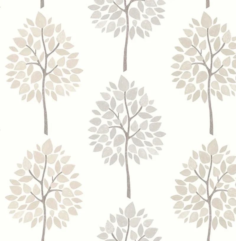 Adorn your walls with this grey and light taupe tree wallpaper. Its block print and hand drawn design gives this botanical wallpaper a Scandinavian style. Ceres is an unpasted, non woven wallpaper.