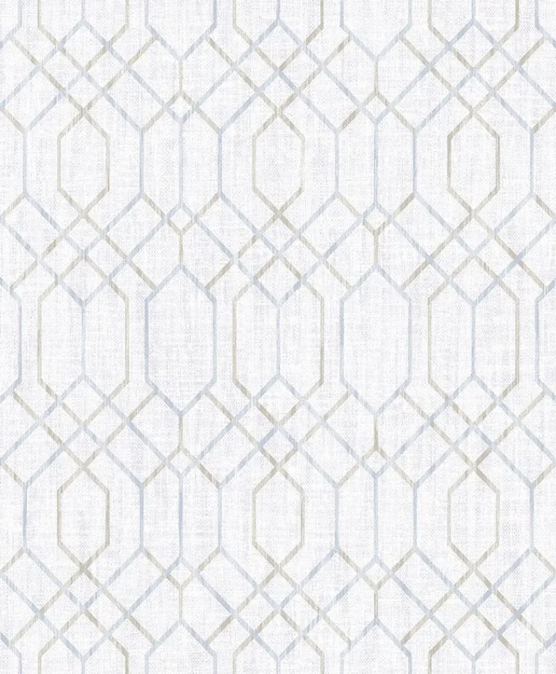 A timeless trellis design with a contemporary twist. The blue and grey geometric print complements a distressed white background, creating a dimensional design. Lyla is an unpasted, non woven wallpaper.