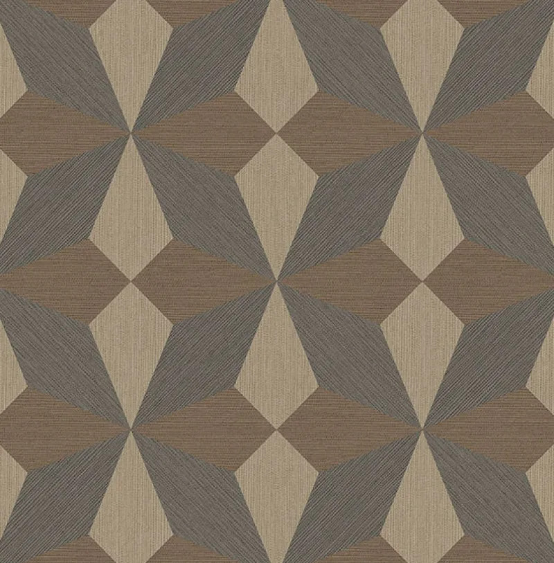 This moody and sophisticated geometric wallpaper features copper, beige, and grey diamonds forming hypnotic patterns. Faux grasscloth elevates the design and provides texture to your walls. Valiant is an unpasted, non woven wallpaper.