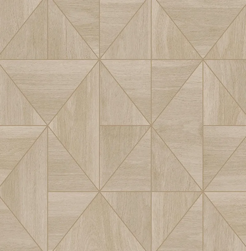 Warm, golden beige wood grain is segmented into triangular tiles in this contemporary geometric wallpaper. The golden tones of the woodgrain are augmented by a gold outline, adding depth and a hint of glamour. Cheverny is an unpasted, non woven wallpaper.