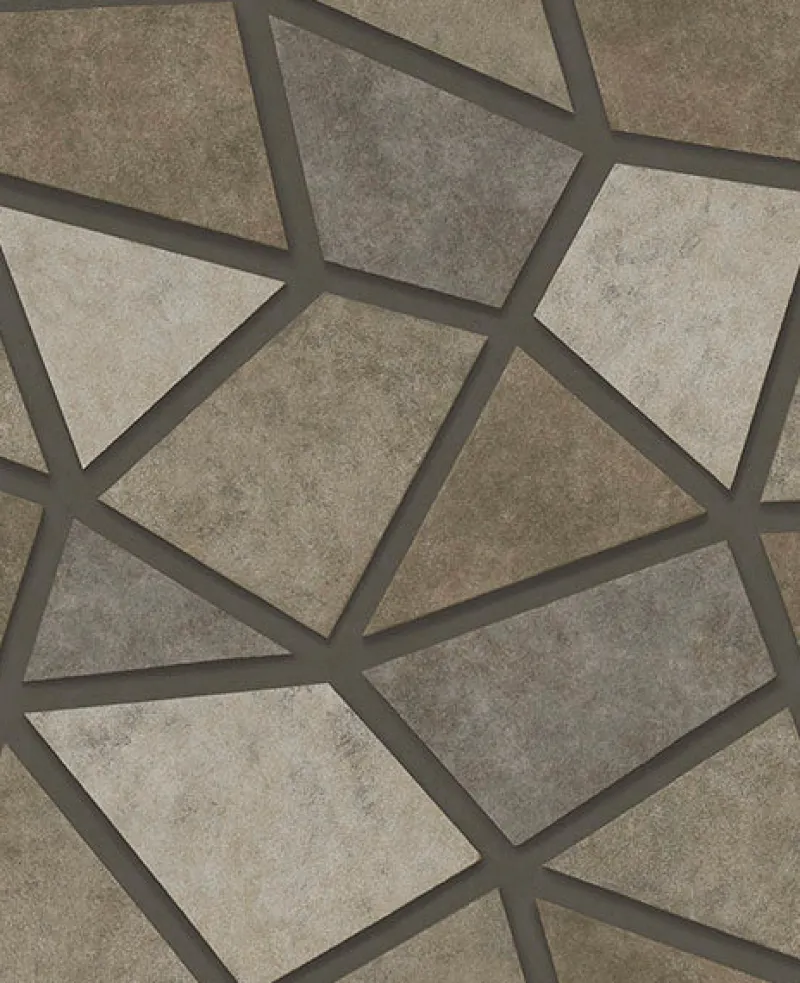 Geometric slabs in an array of earthy browns and greys form a mosaic in this bold, industrial wallpaper. Metallic accents add a touch of brassy glimmer. Coty is an unpasted, non woven wallpaper.