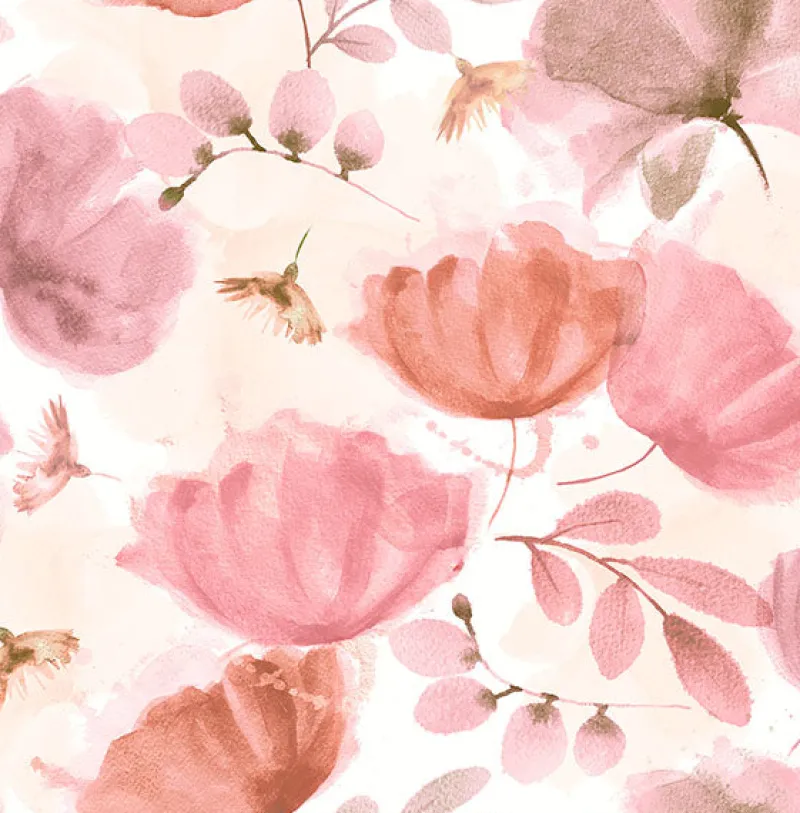 Beautiful flowers with a watercolor effect sweep across an off-white background. Warm coral, pink and rose hues create a nature inspired print with a romantic energy. Zahra is an unpasted, non woven wallpaper. Pattern 2904-25680 could make a lovely and charming addition to not only your kitchen or powder room, but any room in your home!