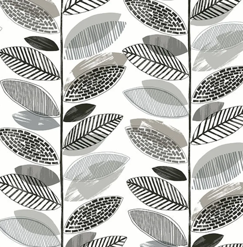A nature inspired wallpaper with a contemporary edge. Painterly leaves feature geometric prints and a modern palette of grey, black and charcoal hues. Nyssa is an unpasted, non woven wallpaper. Pattern 2904-25683 could make a lovely and charming addition to not only your kitchen or powder room, but any room in your home!
