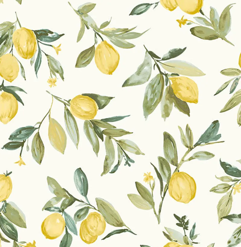 Brighten up your space with this cheerful lemon wallpaper. Glowing yellow fruit pop against a crisp white background, while painterly details create a watercolor effect. Limon is an unpasted, non woven wallpaper. Pattern 2904-25687 could make a lovely and charming addition to not only your kitchen or powder room, but any room in your home!