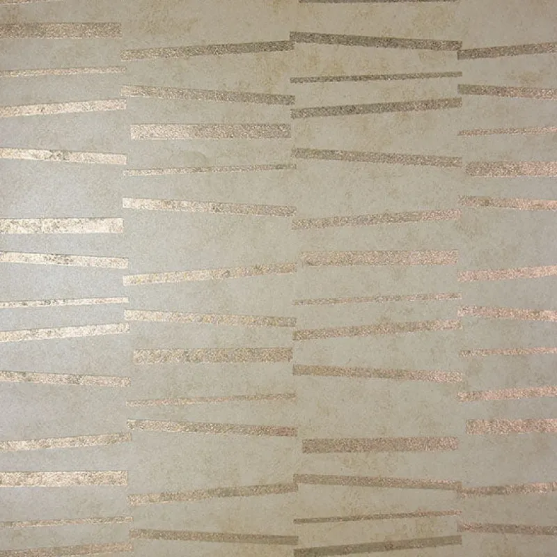 Create a sophisticated space with this light brown and gold geometric design. Complete with its abstract stripe pattern and glistening details, this wallpaper has a glamorous finish. Luminescence is an unpasted, non woven wallpaper.