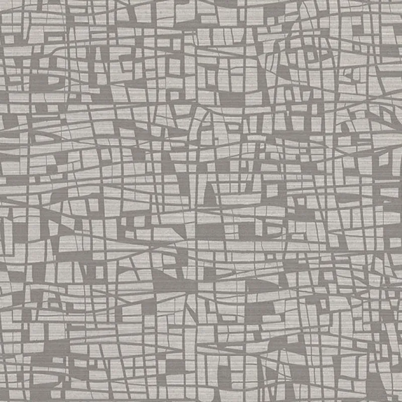 An abstract geometric print shimmers across a light grey distressed backdrop. The metallic accents create a dimensional effect for this modern style wallpaper. Tiffany is an unpasted, non woven wallpaper.