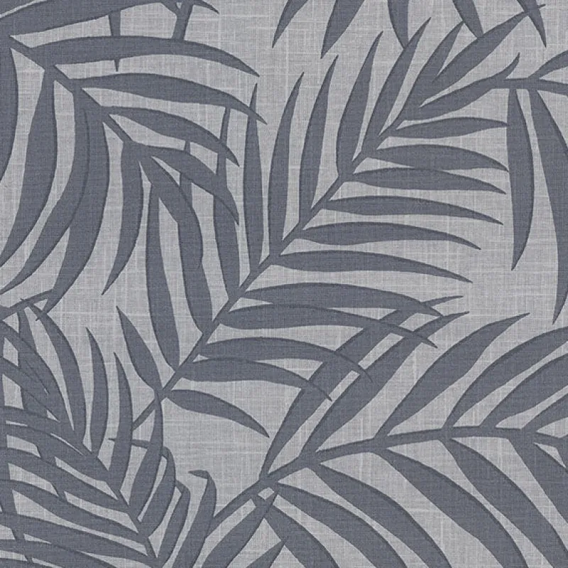 Bring a tropical oasis into any space with this fronds pattern. Atop a pewter linen inspired backdrop, this navy blue botanical design achieves tranquility. Lanai is an unpasted, non woven wallpaper.