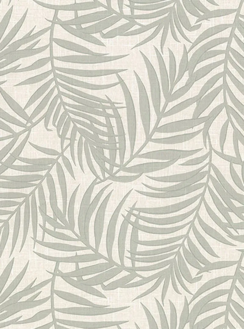 Large scale fronds effortlessly complement a beige linen inspired backdrop in this botanical design. The neutral color palette creates a serene feel for any space. Lanai is an unpasted, non woven wallpaper.