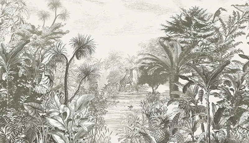 Bask in the splendor of a jungle safari with this stunning illustrative wall mural! Inked with intricate attention to detail, this scenic black and white mural depicts a lush tropical forest where zebras, giraffes and tigers scroll amongst the foliage. Into the Wild Grey Wall Mural comes on 7 panels
