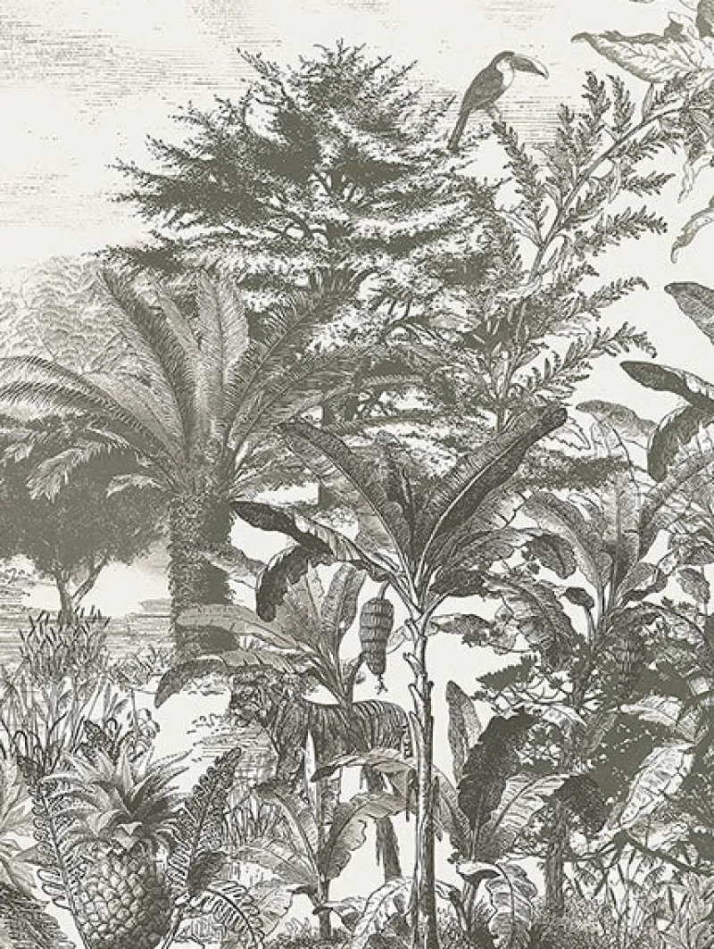 Enjoy a touch of wild splendor with this beautifully illustrated jungle wall mural. A tiger stalks through the tropical foliage while a toucan watches from the safety of a tall tree, each detail intricately inked in black against a cool white backdrop. Tiger Grey Wall Mural comes on 3 panels