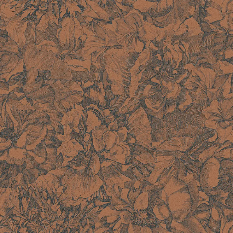 Achieve a dreamy and romantic ambiance in any room with this floral wallpaper. Large scale flowers are intricately inked in black against a copper backdrop bringing warmth and modern sophistication to your walls. Auguste is an unpasted, vinyl on non woven wallpaper.