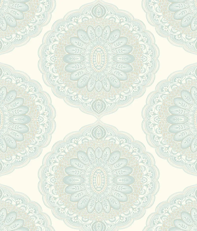 With metallic platinum accents, this boho chic print radiates elegance. Stunning grey-blue medallions shimmer against an eggshell background, creating a sophisticated and global look. Bolinas is a prepasted, high performance wallpaper.