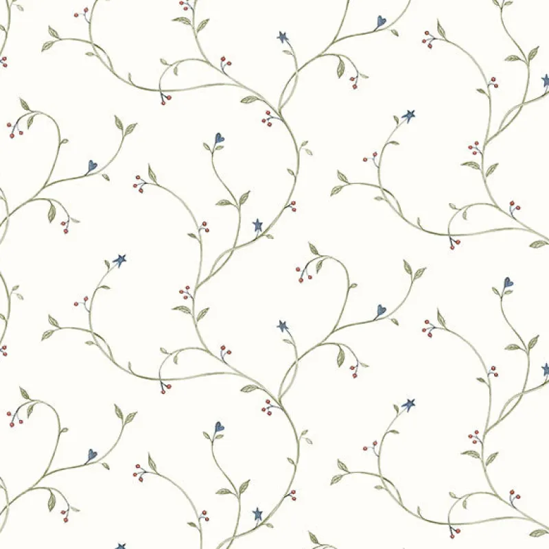 Beautiful hearts and stars bloom from a trail of green leaves. This whimsical twist on a traditional floral design if full of charm. Kurt is a prepasted, non woven blend wallpaper.