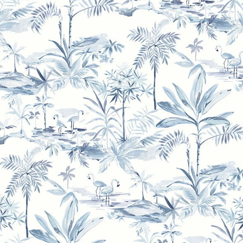 Bring a tropical touch to walls with this watercolor island design. Its blue hues, flamingos, and palm trees lend to its eclectic style. Lagoon is a prepasted, non woven blend wallpaper.