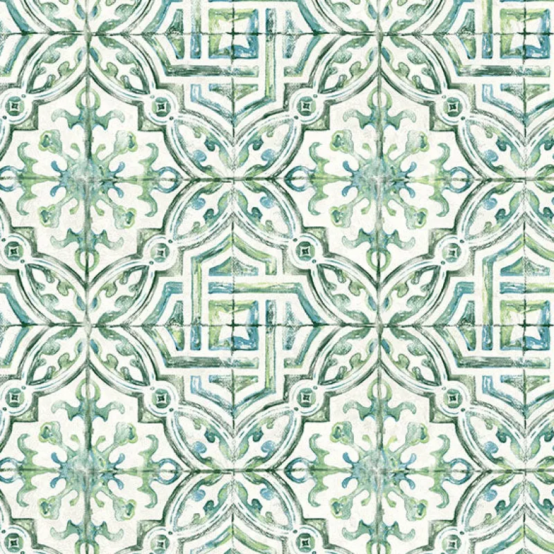An organic green and white color palette makes this faux tile wallpaper timeless. Its worn details add to the authentic look of tiles in this Spanish inspired design. Sonoma is a prepasted, non woven blend wallpaper.