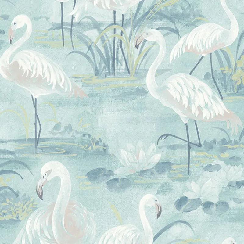 Make a chic and stylish look in any space with this flamingo print design. The aqua color palette and hand painted illustration lend to its whimsical feel. Everglades is a prepasted, non woven blend wallpaper.