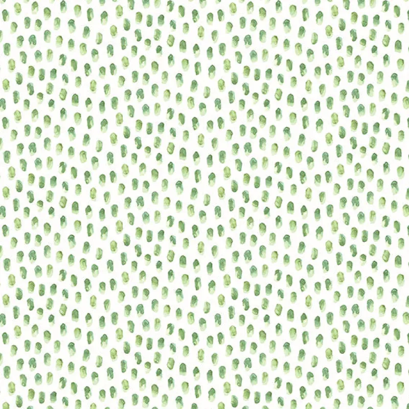 Green watercolor style dots create a beautiful pattern. The hand painted dots add a dimensional look to walls, perfect for adding a splash of color to a kitchen or powder room. Sand Drips is a prepasted, non woven blend wallpaper.