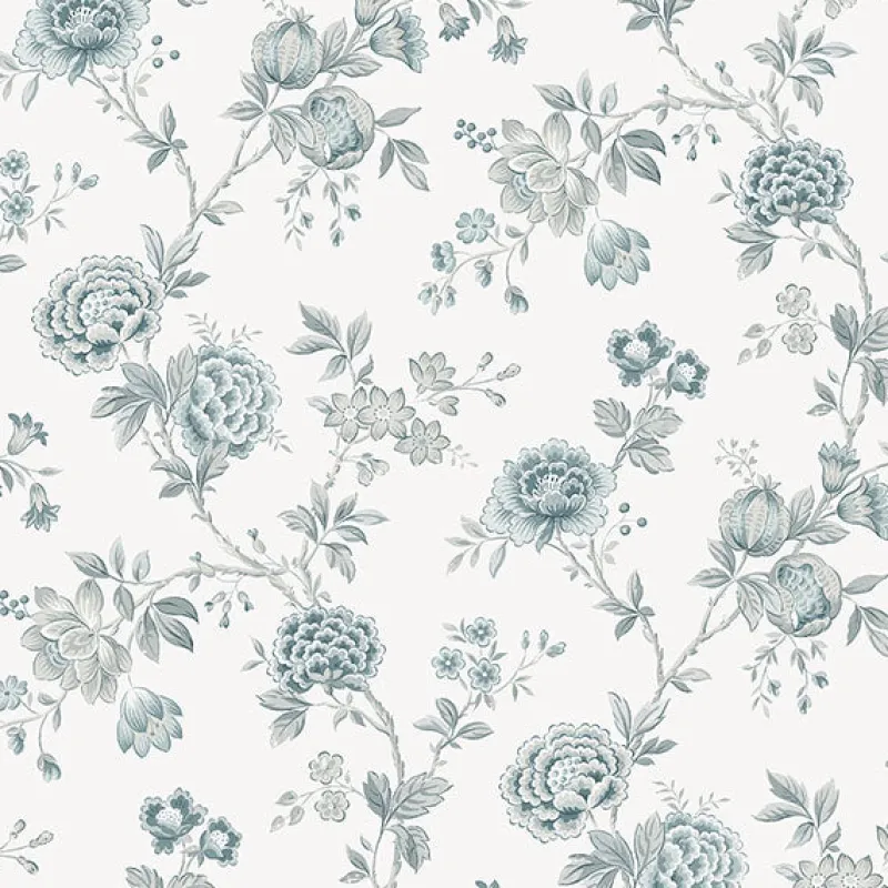 This charming Jacobean floral is truly timeless, both in design and color. The teal blue florals twine upwards along delicate vines against a crisp white backdrop. Chrysanthemum is a prepasted, non woven wallpaper.