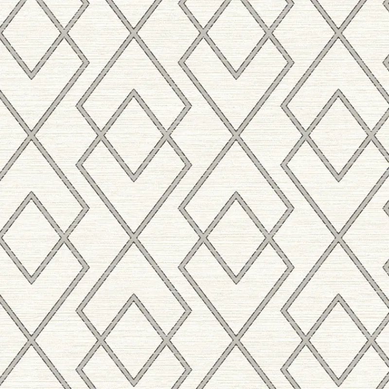 This geometric trellis pattern is simple, bright and timeless. The diamonds are outlined in soft grey against a creamy background lined with subtle taupe raised inks. Blaze is a prepasted, coated heavyweight paper wallpaper.