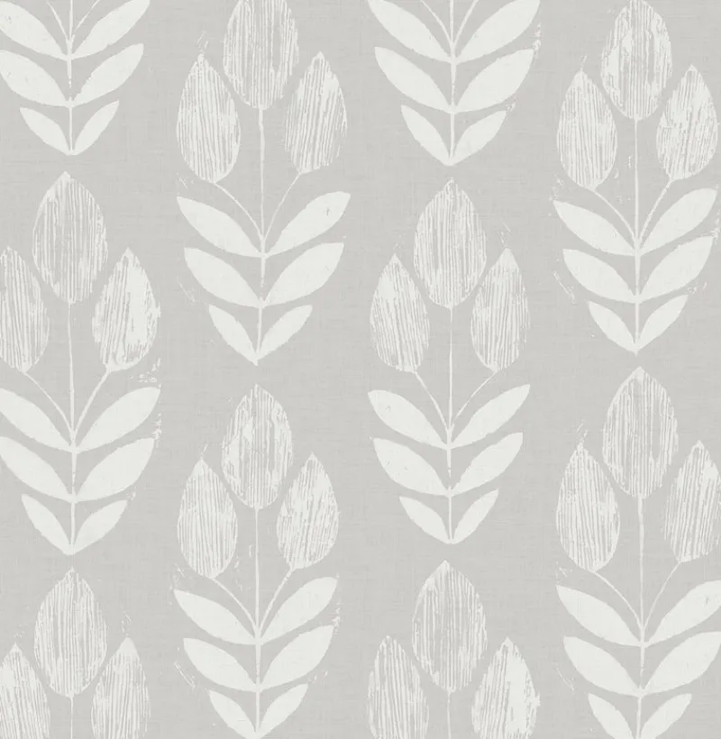 This Scandinavian-inspired floral is filled with simple, nature-inspired charm. The off-white block printed tulips decorate a grey faux linen backdrop. Garland is a prepasted, non woven wallpaper.