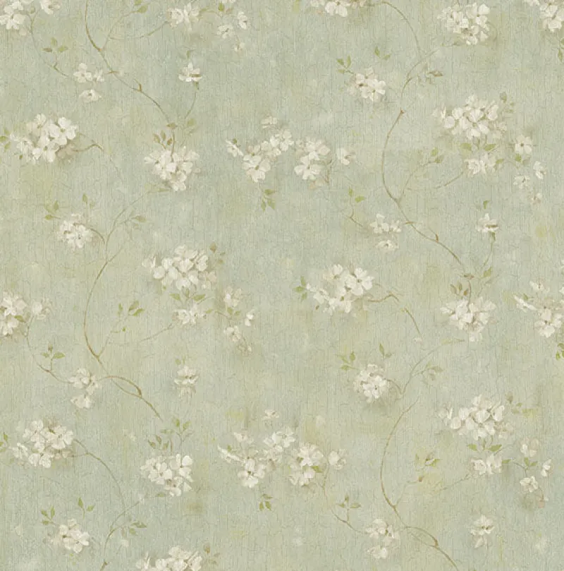 Add antique charm to your home with this quaint floral wallpaper. The trail of blossoming white flowers are tingled pink against a blended aqua background, thin crackled lines throughout giving the design a rustic, aged look. Braham is a prepasted, non woven wallpaper.