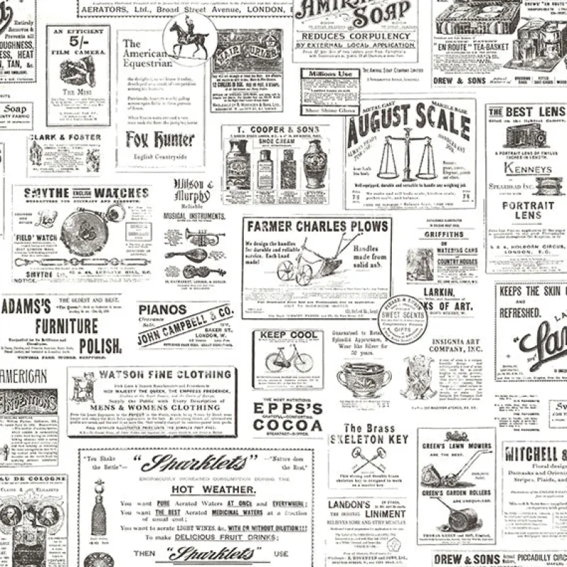 Antique newspaper advertisements promote their goods in this this nostalgic vintage design. The faded black ink printed across an off-white backdrop adds to the historic charm. Adamstown is a prepasted, non woven wallpaper.