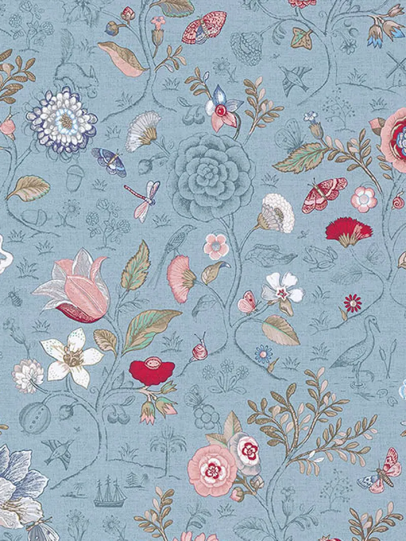Bright flowers blossom in an array of colors against a blue background in this eclectic wallpaper. With charming animals, this fanciful wallpaper paints a whimsical woodlands scene. Espen is an unpasted, non woven wallpaper.