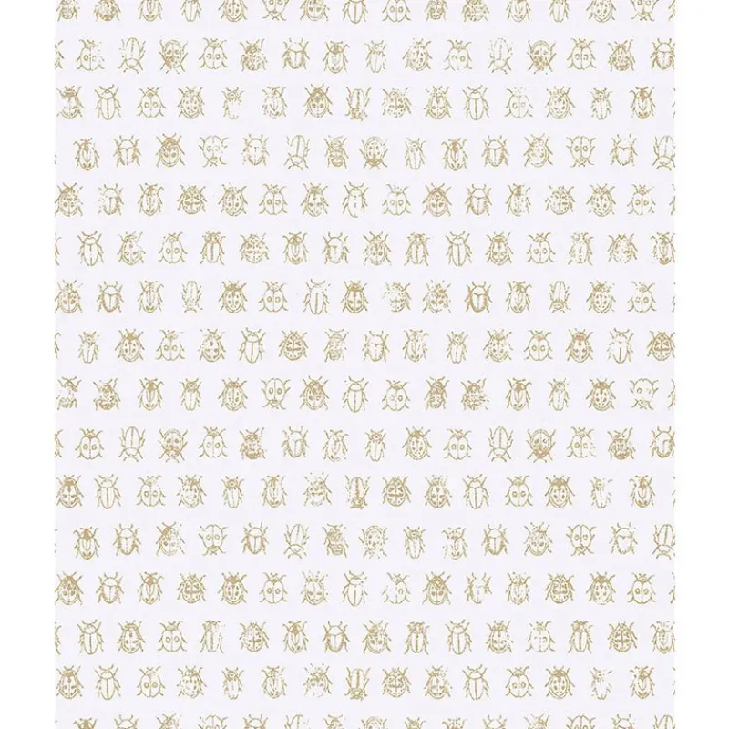 Brighten up your walls with playful shimmering beetles. With gold ink and a white hue, this fanciful wallpaper will make your walls shine. Flikker is an unpasted, non woven wallpaper.