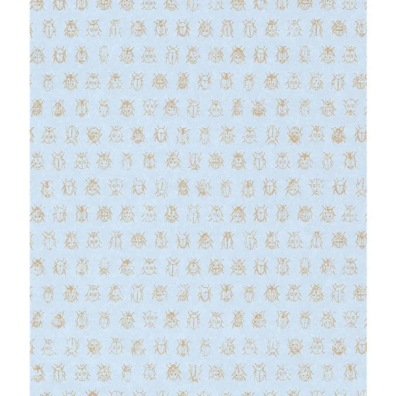 Dazzling and whimsical, this wallpaper glimmers with golden beetles. With a fresh light blue background and metallic ink details, this eclectic wallpaper will brighten up your walls. Flikker is an unpasted, non woven wallpaper.