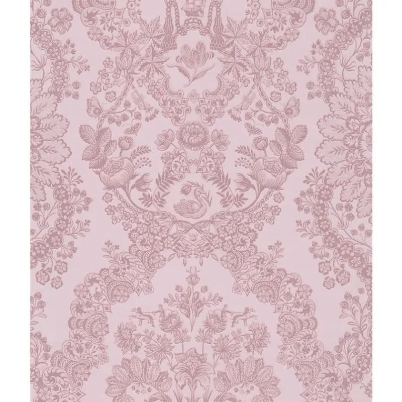 With woodland flowers, ships and joyful trumpets, this large damask wallpaper has a playful feel. Raised ink details and a soothing blush hue create a stunning eclectic wallpaper. Grillig is an unpasted, non woven wallpaper.