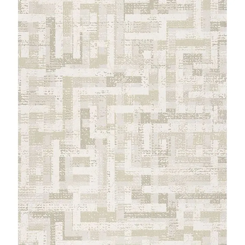 This geometric wallpaper has an abstract woven print. The mix of matte, surface print inks, and shimmering metallic inks. The neutral color palette adds to the modern design.