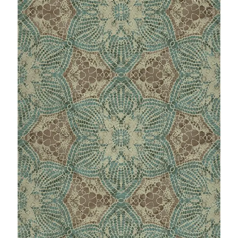 This large scale medallion wallpaper has a stunning Moroccan print. The brown and teal print is accented by a lacey metallic gold design. Floral accents are revealed within the gold inks.