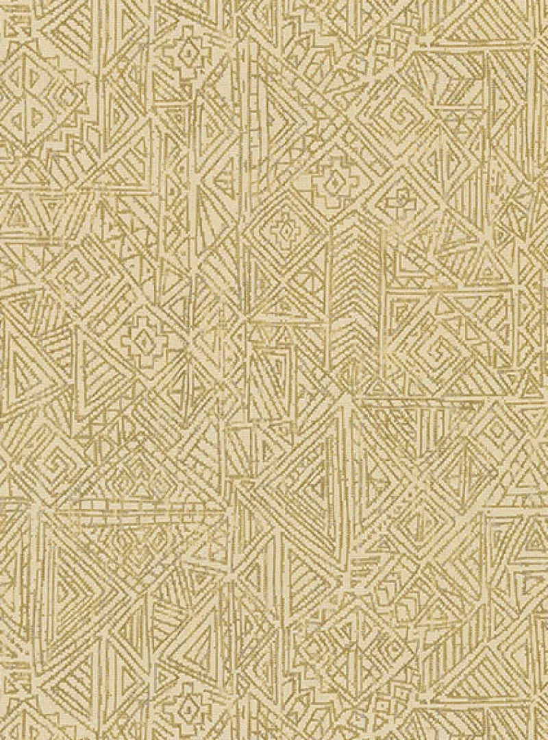 Global with a glamorous flair, this tribal inspired wallpaper is complete with a gold background and raised inks. Its intricate pattern will add a bohemian touch to rooms. Longmont is an unpasted, non woven wallpaper.