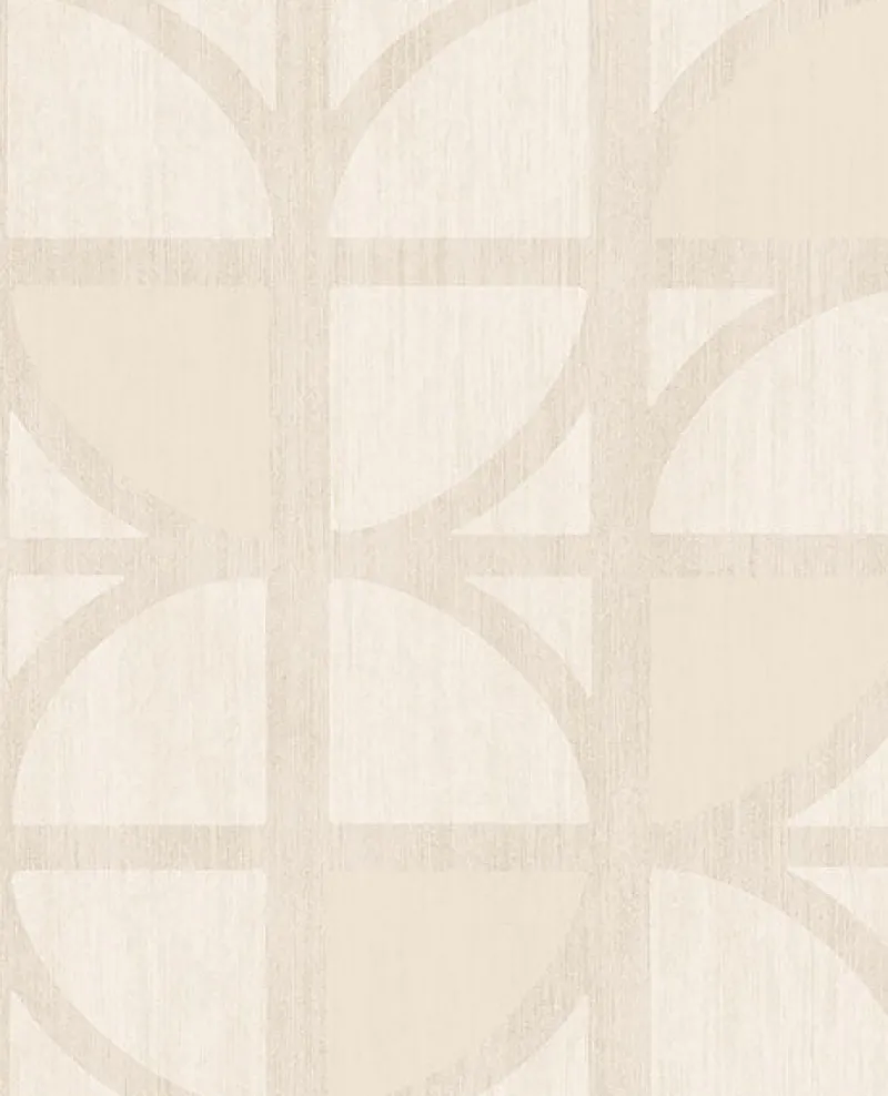 A contemporary take on mid-century aesthetics, this wallpaper’s geometric frame gives the impression of sprouting tulips. The beige frames sits against a cream background, with some spaces receiving a metallic glaze. Thin, raised vertical striations give this wallpaper a textural feel and a faux linen appearance. Tulip is an unpasted, non woven wallpaper.