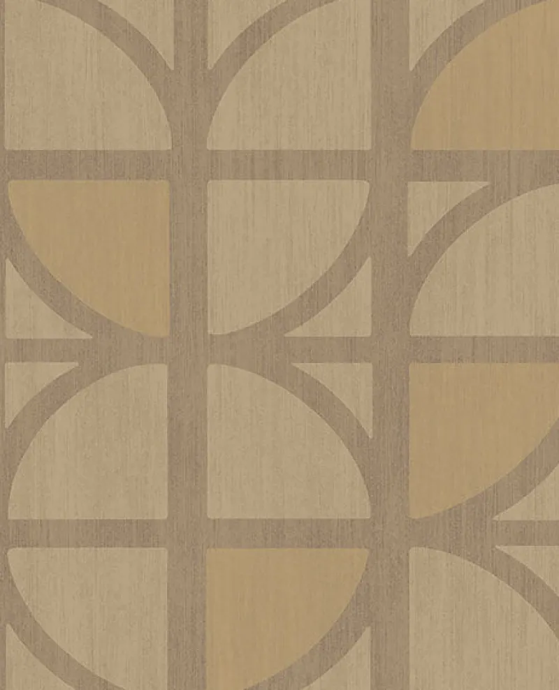 Add some contemporary mid-century flair to your home with this architectural wallpaper. Flowers appear to bloom from a geometric frame, with golden metallic panels and striations giving the design extra flair. The raised ink bands throughout provide overall texture. Tulip is an unpasted, non woven wallpaper.