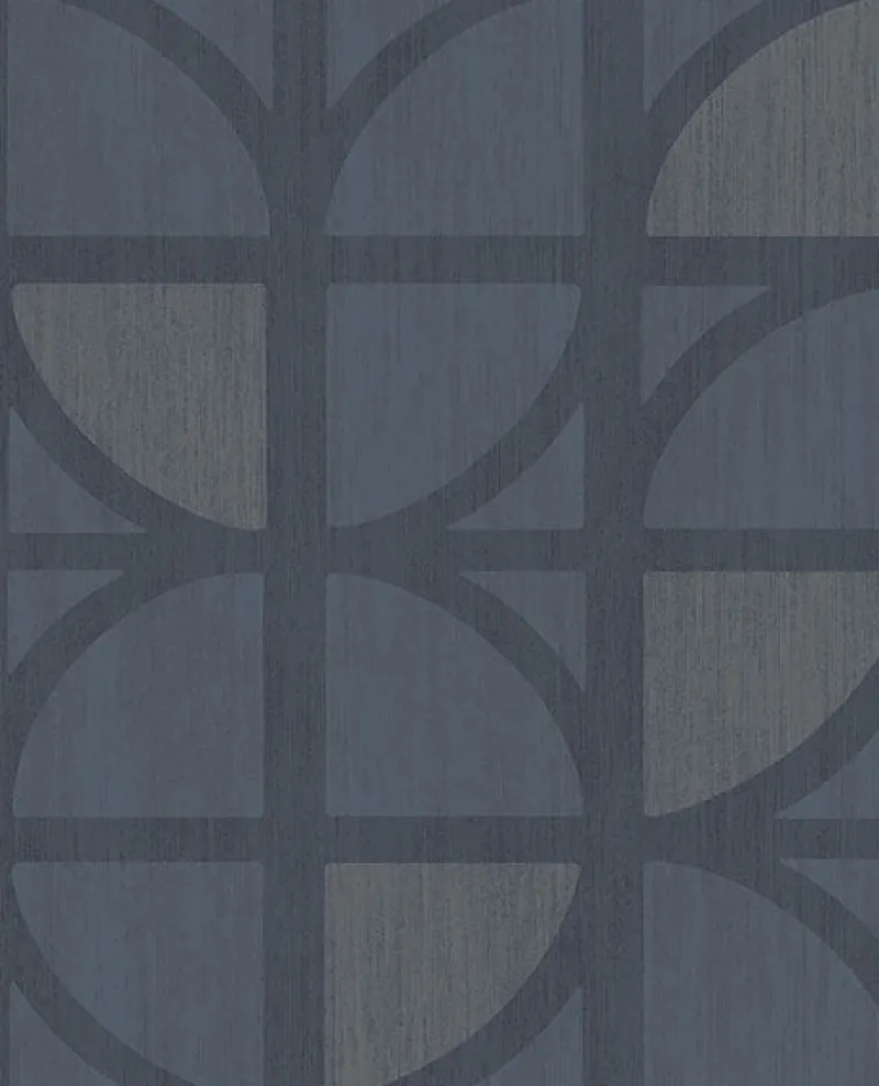 A contemporary take on mid-century aesthetics, this wallpaper’s geometric frame seems to sport blooming flowers. The dark blue frame sits atop a denim backdrop, with sporadic panels given a metallic glaze. Vertical striations of raised inks throughout give the design overall texture. Tulip is an unpasted, non woven wallpaper.