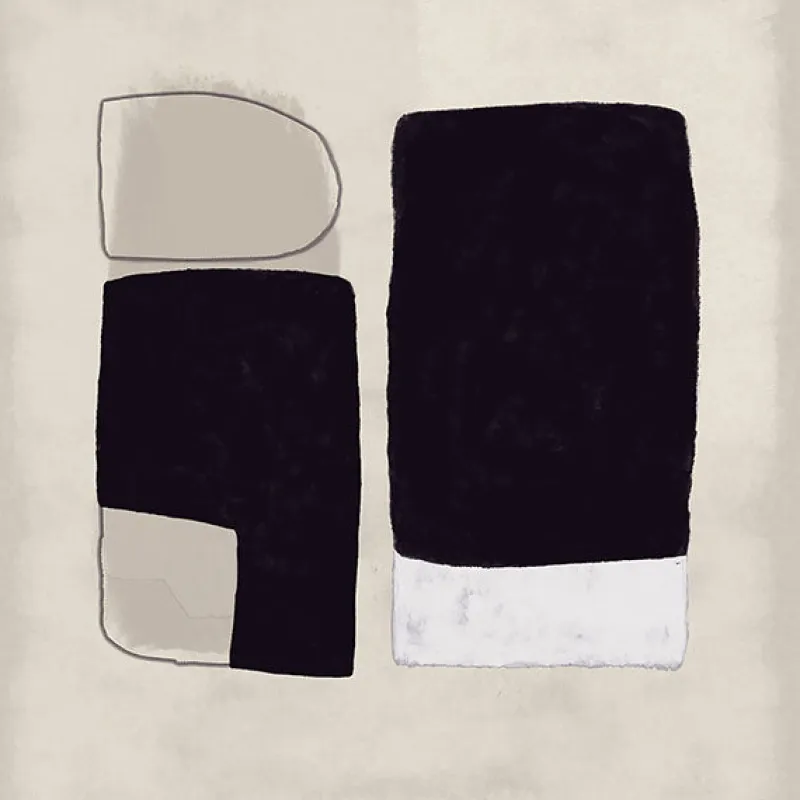 This compelling modern mural features two color-blocked columns against a neutral background painted in broad strokes, allowing layers of color to break through sporadically. The columns are composed of irregularly-shaped black, white, and taupe blocks, with loose outlining around the taupe sections providing dynamic contrast to the solid sections. Natural Abstract Wall Mural comes on 4 panels and measures 9-ft 10-in by 9-ft 10-in when assembled.