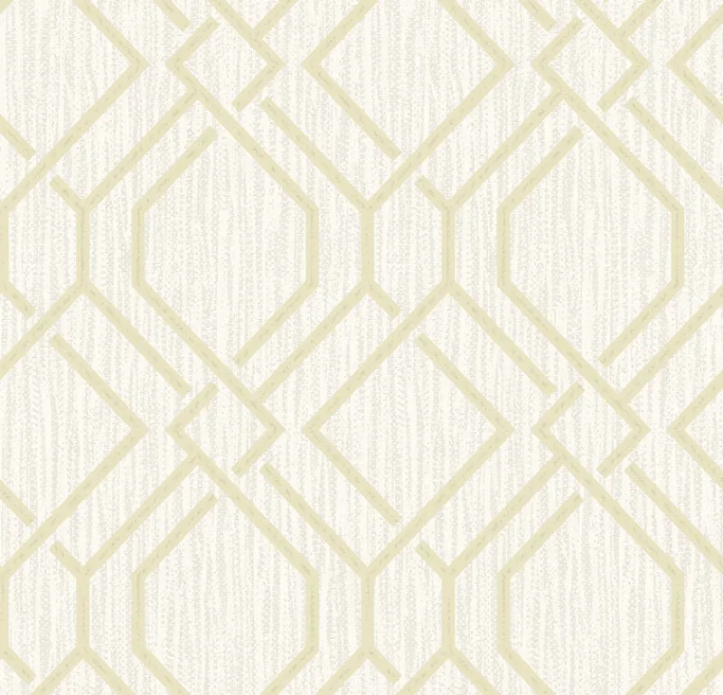 Add elegance to your home with this gilded trellis design. The interwoven geometrics are embellished with metallic gold ink, the off-white distressed backdrop softening the high end finishes. Frege is an unpasted, vinyl on paper wallpaper.