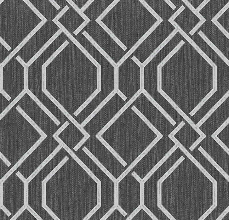 Enjoy modern sophistication with this elegant trellis pattern. Each grey geometric is accented with metallic ink and lies atop a distressed navy backdrop. Frege is an unpasted, vinyl on paper wallpaper.