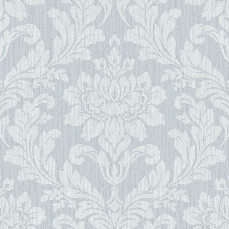 Add timeless elegance to your interiors with this luxurious damask print. A central floral is surrounded by a leafy scroll border, all inked in white against a distressed light blue backdrop. Galois is an unpasted, vinyl on paper wallpaper.