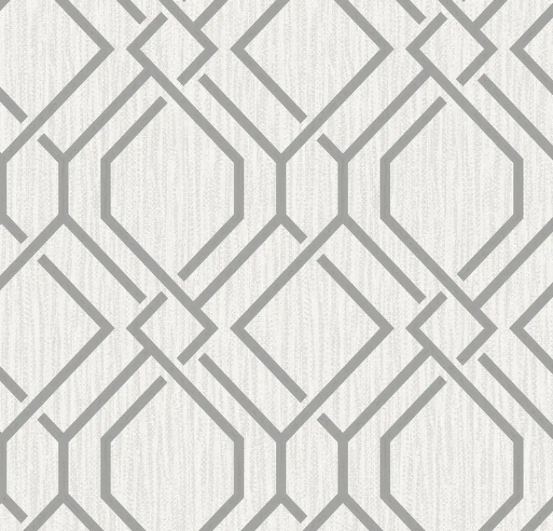 Bring modern elegance to your home with this classic trellis pattern! The interlocking grey geometrics are accented with metallic inks, the distressed off-white backdrop adding an extra layer of dimension. Frege is an unpasted, vinyl on paper wallpaper.