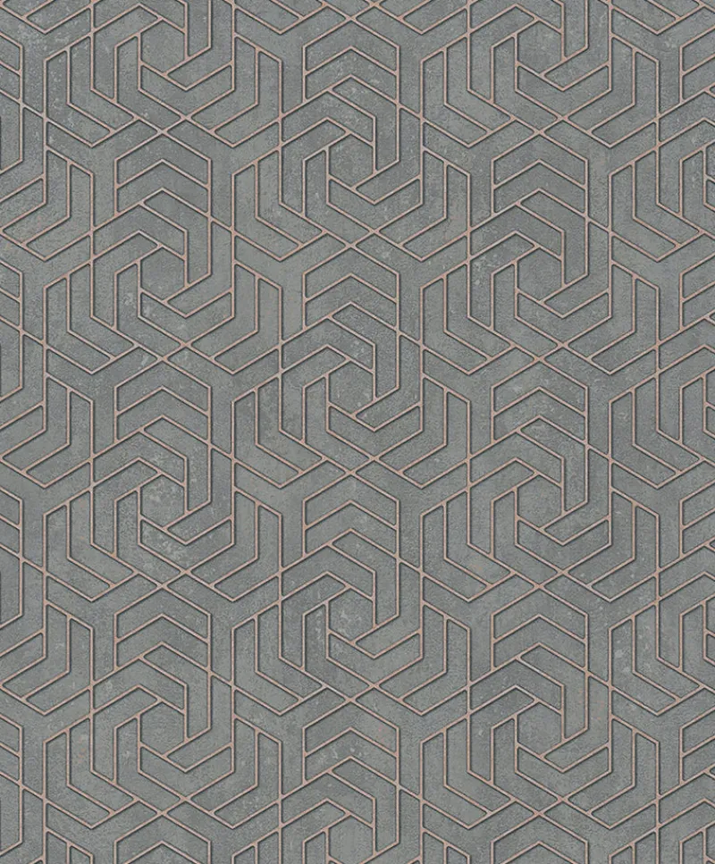 Infuse your interiors with chic industrial flair with this dazzling geometric wallpaper. Each segment is outlined with rose gold inks against a textured and distressed dark grey backdrop for an undeniable industrial feel. Tama is an unpasted, vinyl on non woven wallpaper.