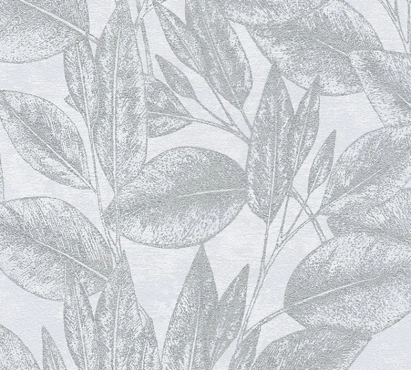 Enjoy a touch of glamour with this alluring leaf design. A distressed white backdrop highlights the gorgeous large-scale tropical leaves inked on top with a dazzling metallic silver finish. Suki is an unpasted, vinyl on non woven wallpaper.