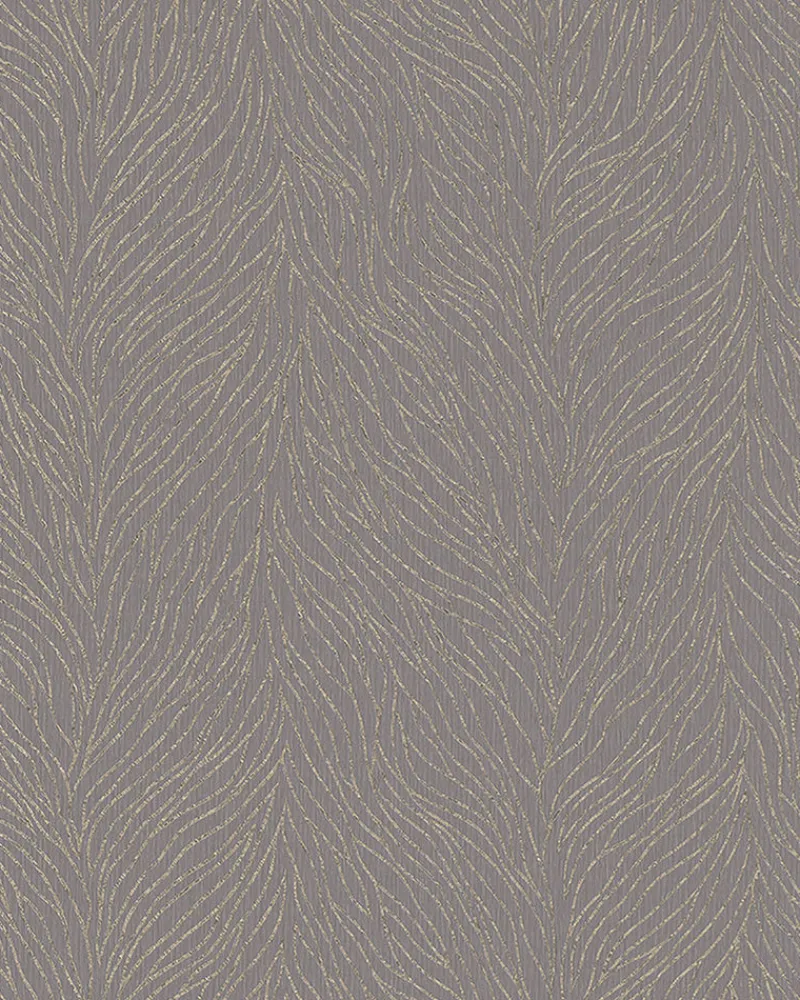 Enjoy an elegant fusion of pattern and texture with this modern wallpaper. Each abstract gold curve has a slight botanical look enhanced by the textured lavender-grey background. Tomo is an unpasted, vinyl on non woven wallpaper.